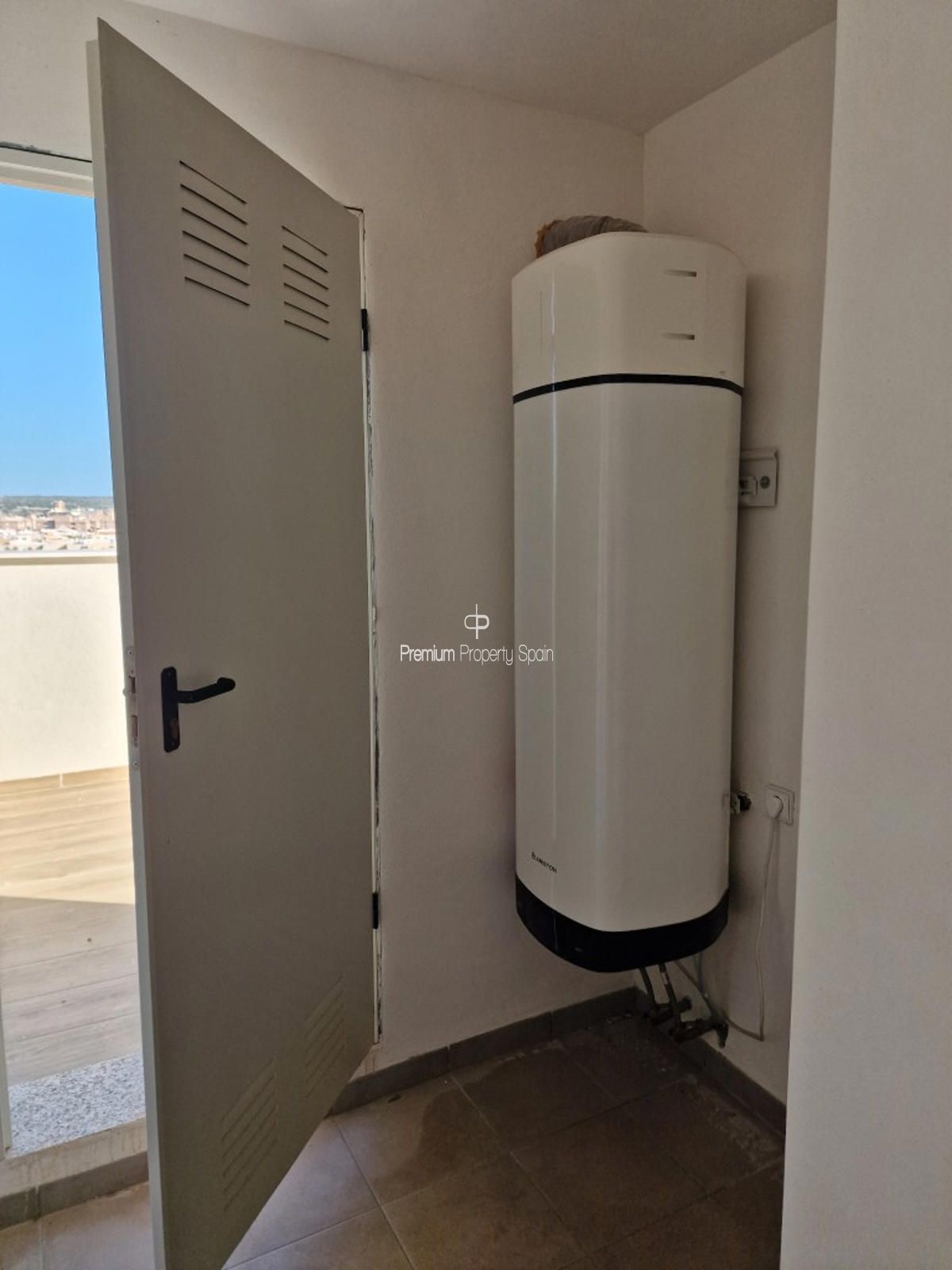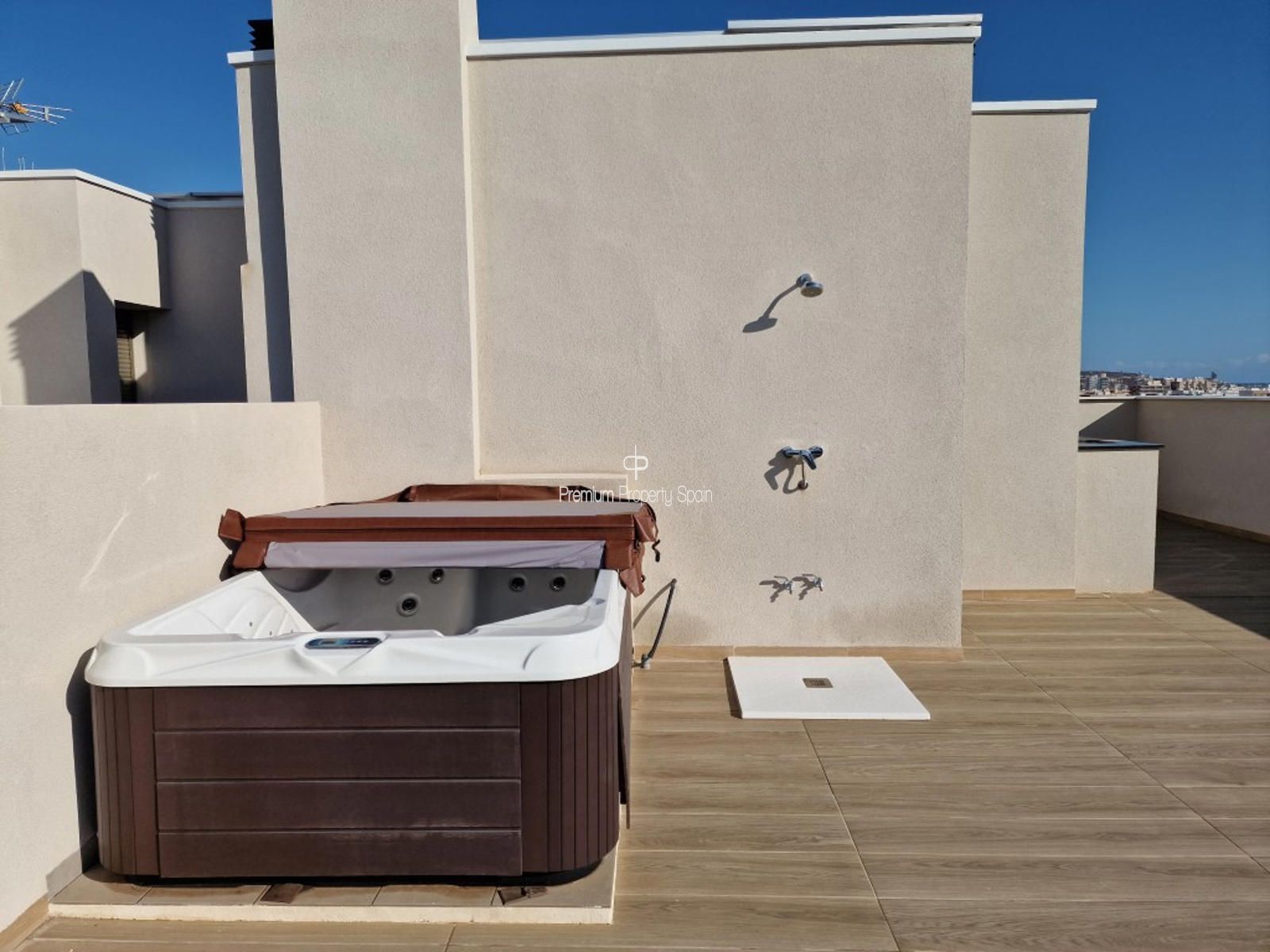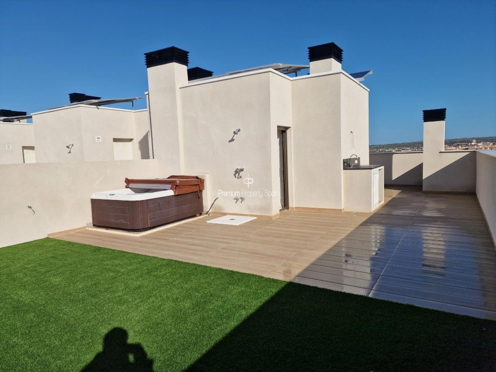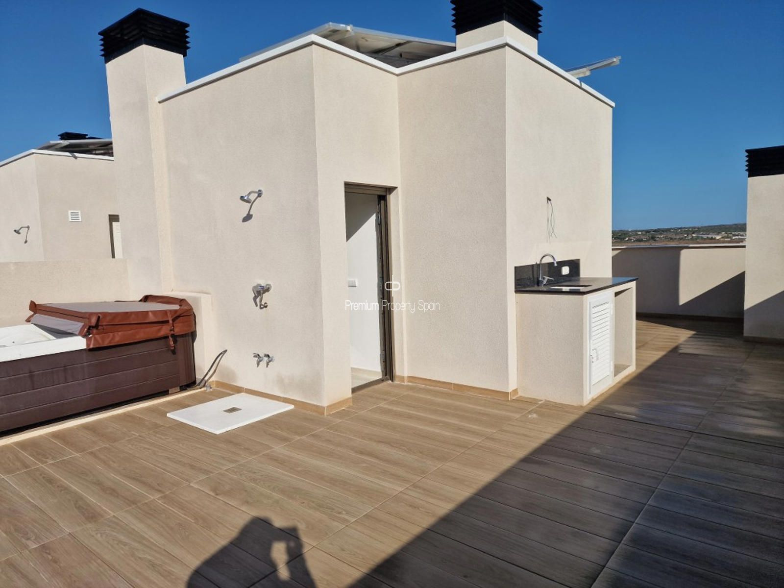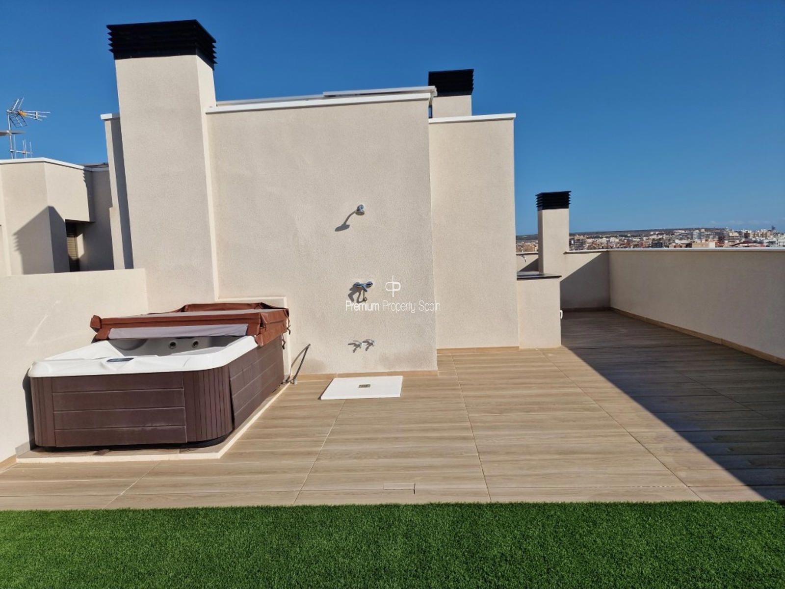 Penthouse lumineux de nouvelle construction, 3 chambres (une en suite) + 2 salles de bains, toutes extérieures, avec une terrasse de 17m2 et un solarium privé fini de 77m2. Situé à 150m de la plage, à Santa Pola - Costa Blanca - Alicante.
