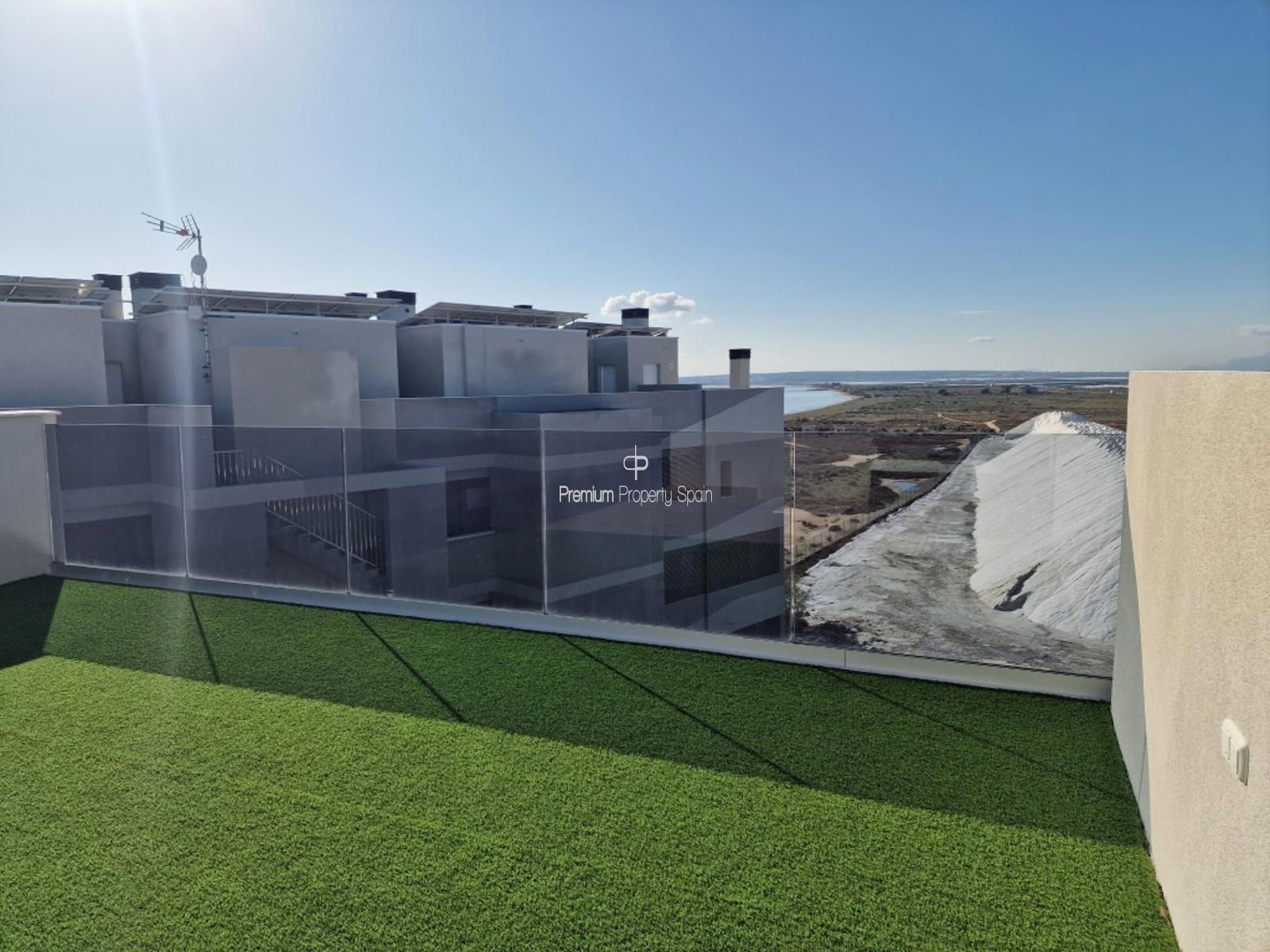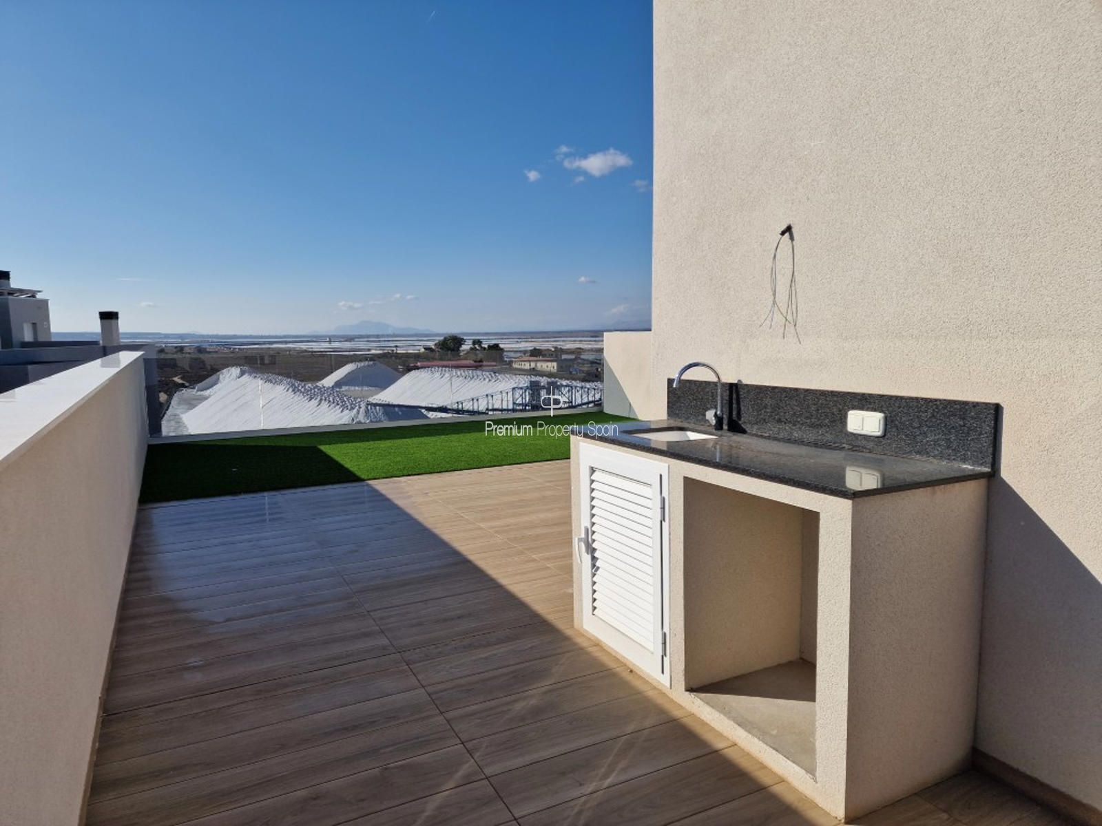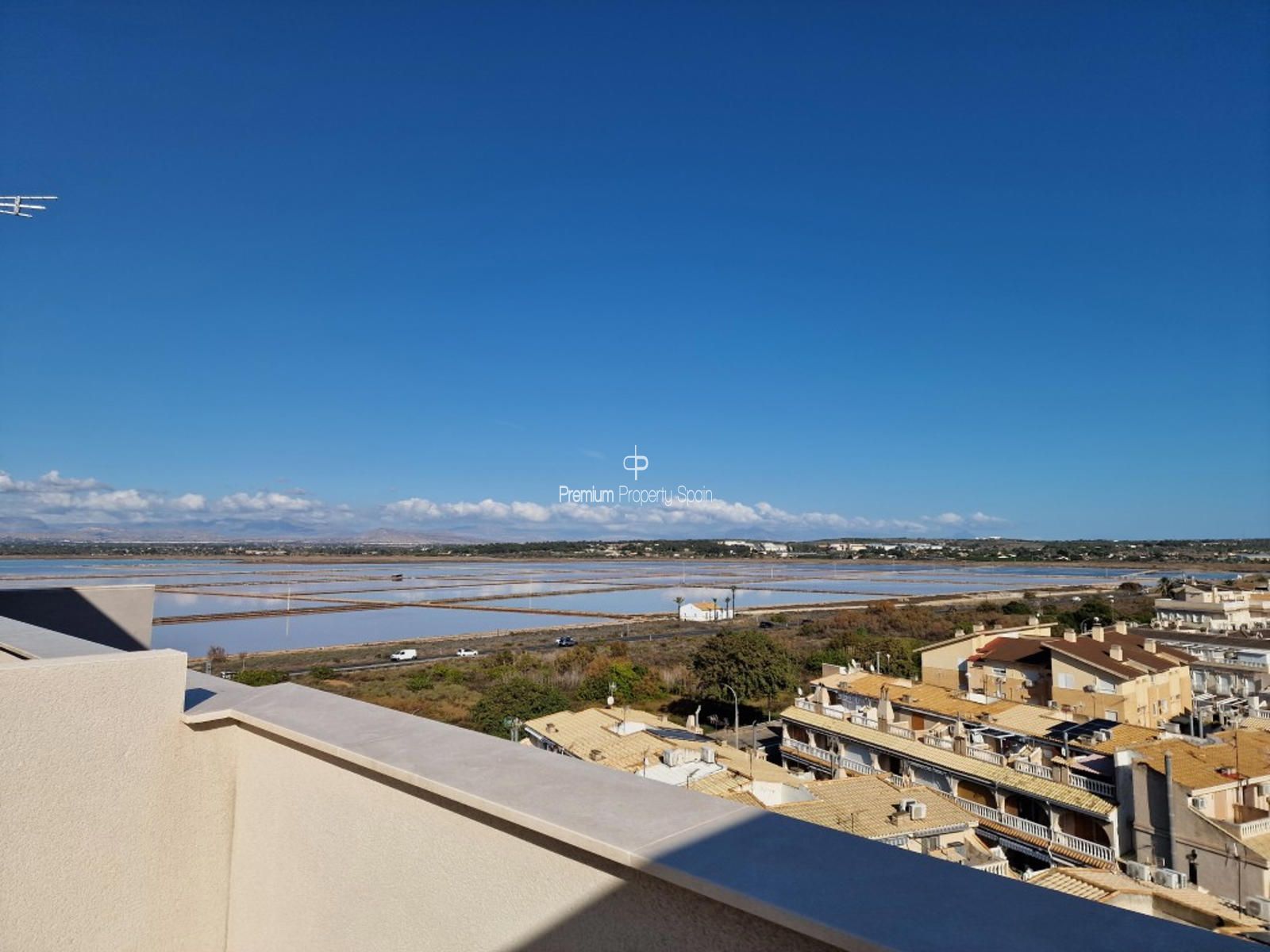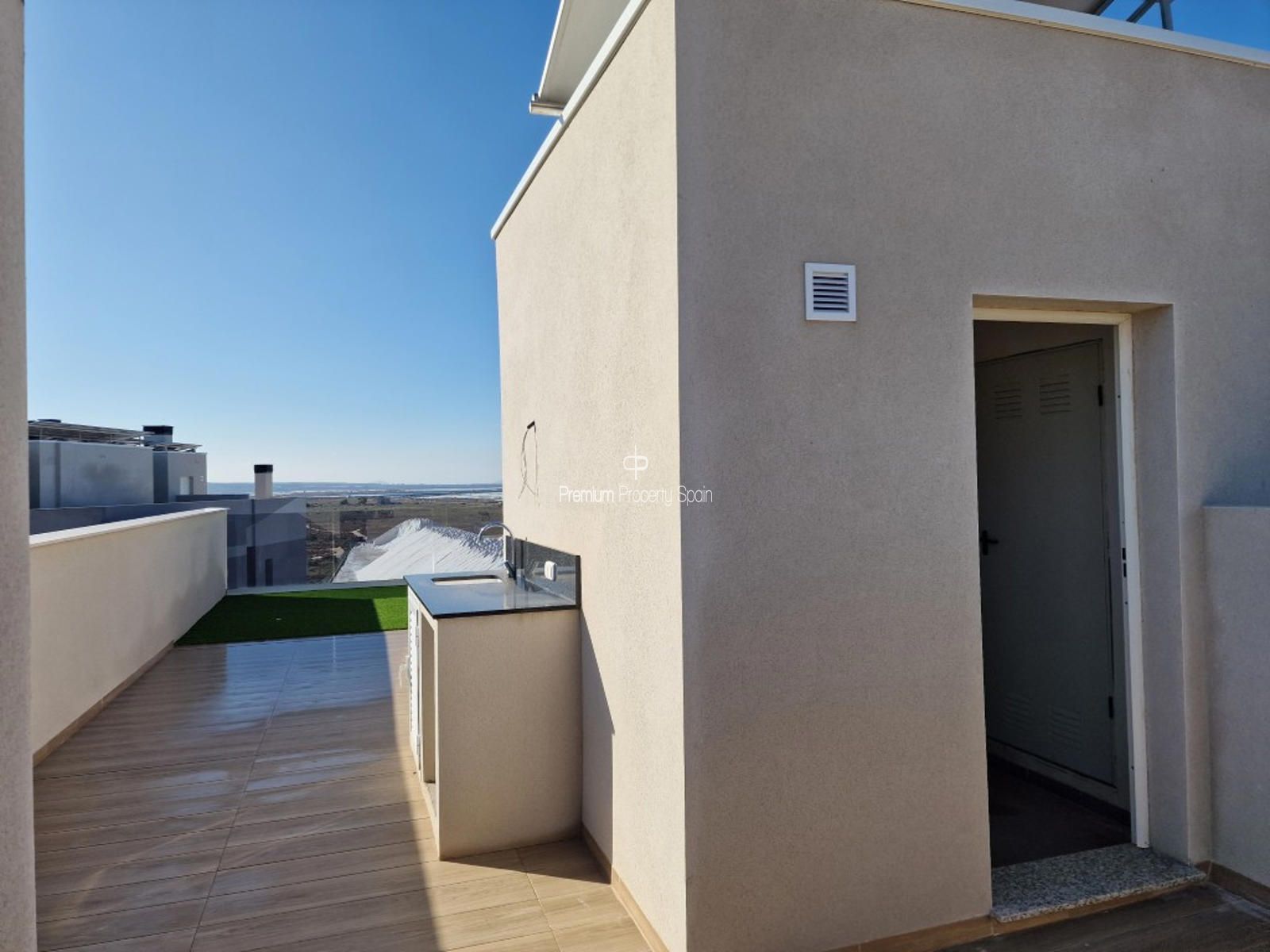 Penthouse lumineux de nouvelle construction, 3 chambres (une en suite) + 2 salles de bains, toutes extérieures, avec une terrasse de 17m2 et un solarium privé fini de 77m2. Situé à 150m de la plage, à Santa Pola - Costa Blanca - Alicante.
