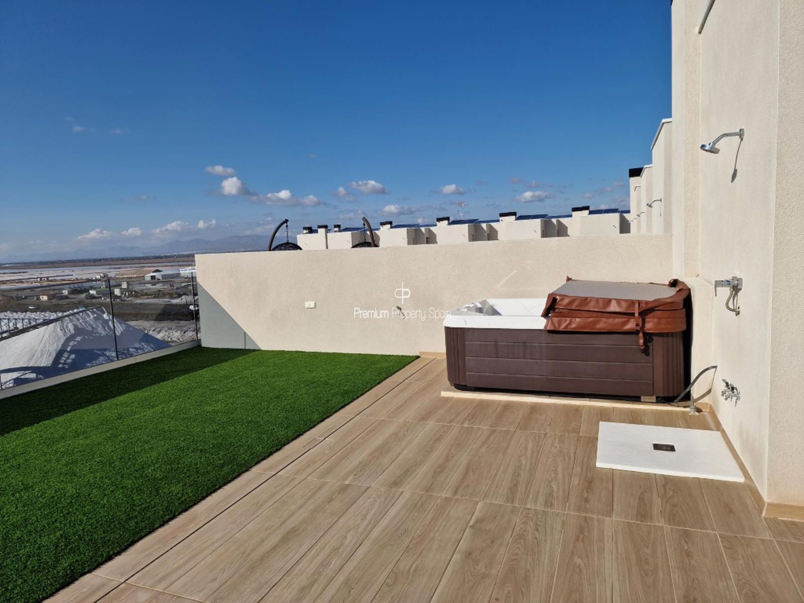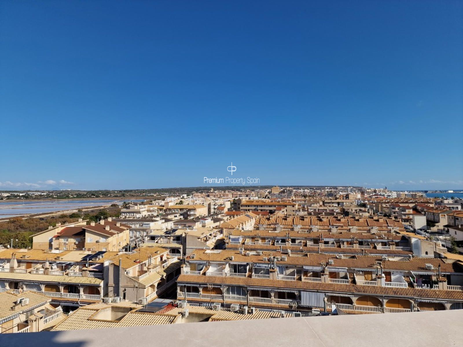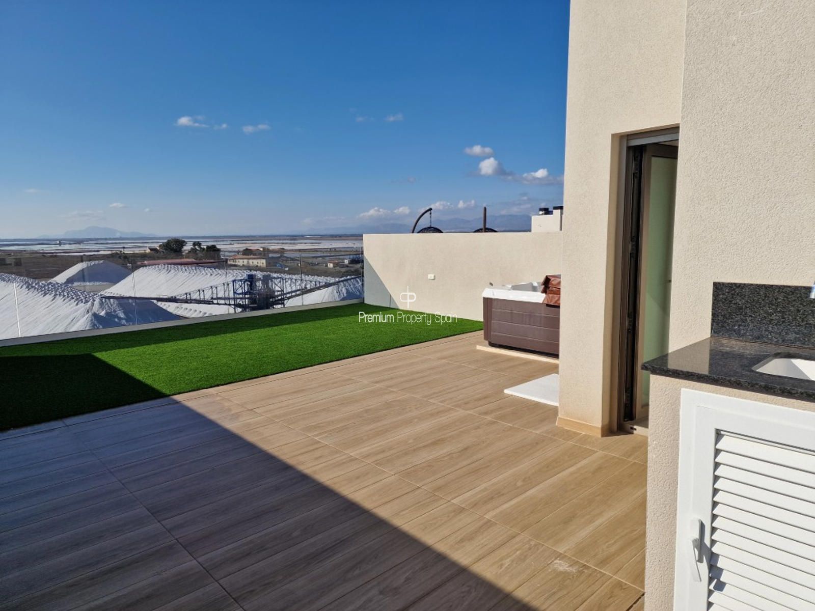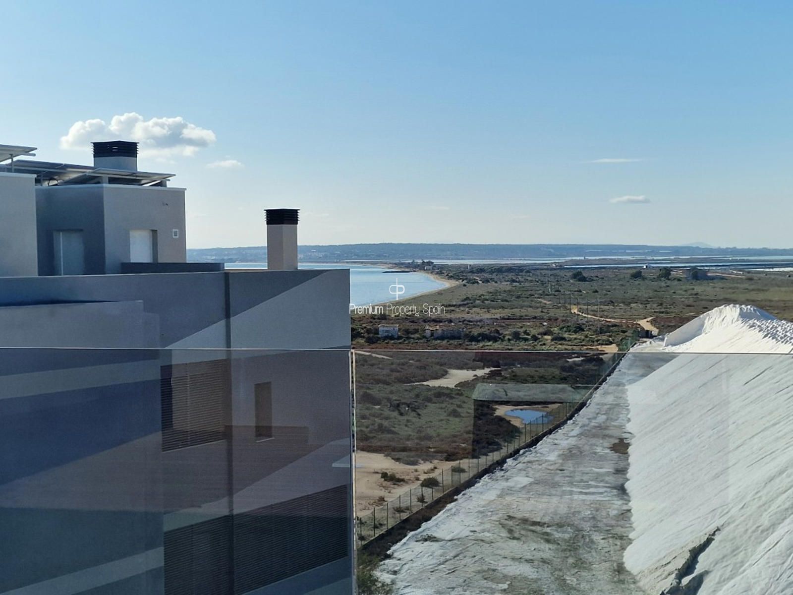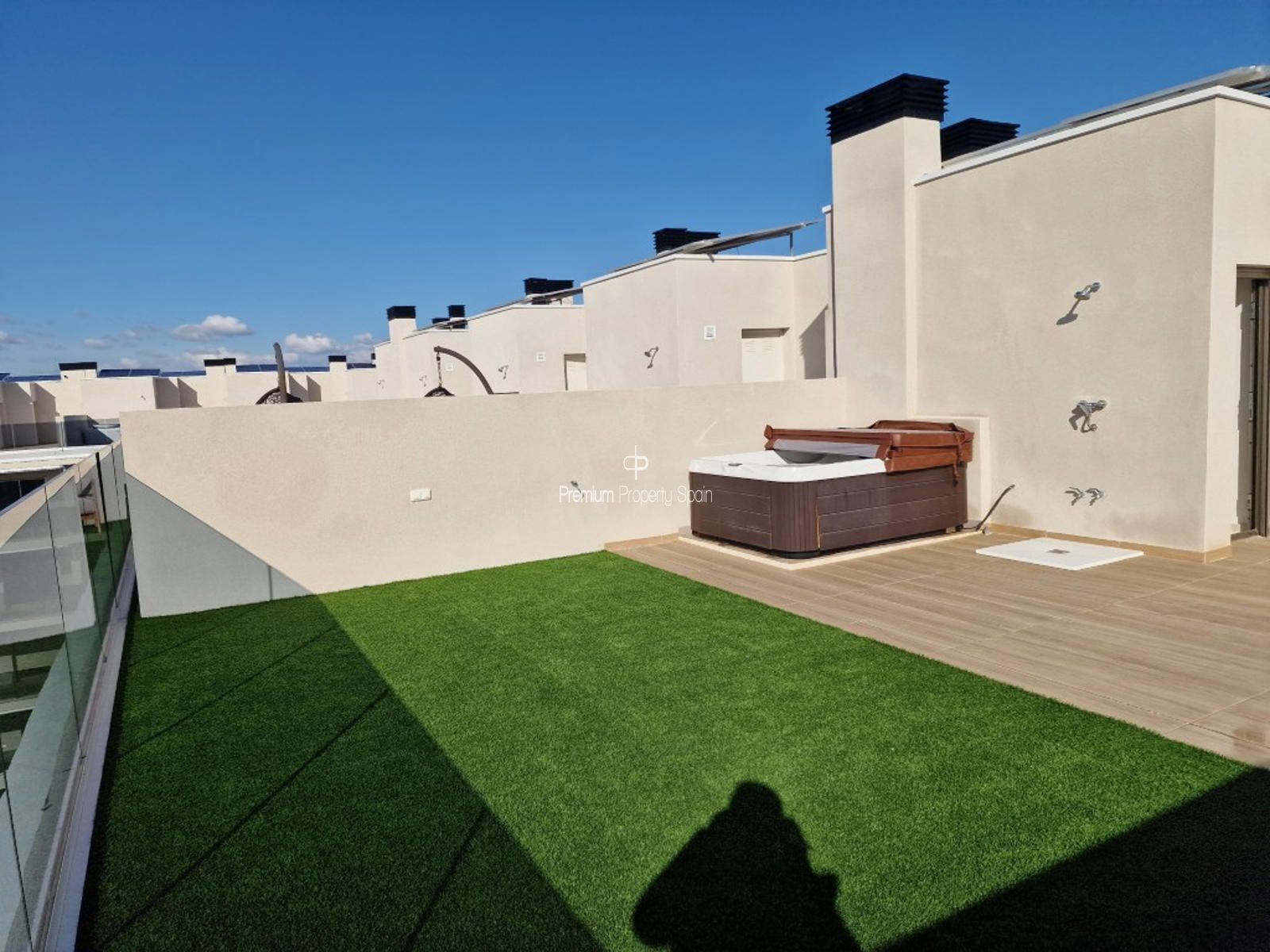 Penthouse lumineux de nouvelle construction, 3 chambres (une en suite) + 2 salles de bains, toutes extérieures, avec une terrasse de 17m2 et un solarium privé fini de 77m2. Situé à 150m de la plage, à Santa Pola - Costa Blanca - Alicante.